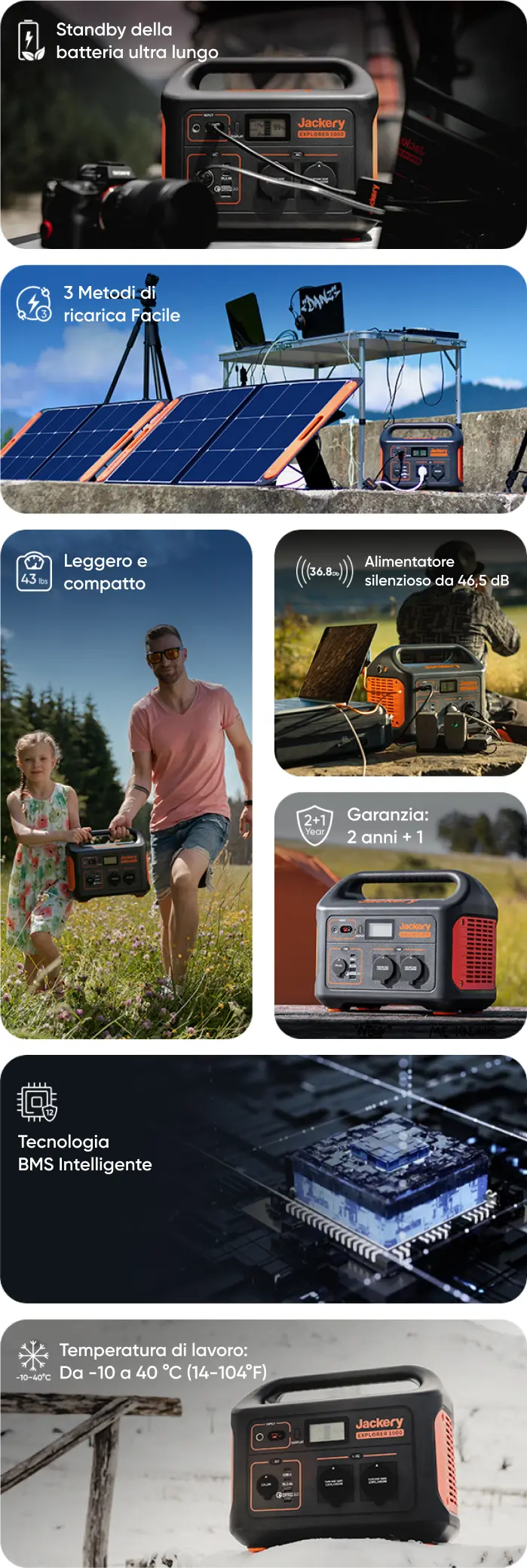 La centrale elettrica portatile Jackery Explorer 1000 carica otto dispositivi contemporaneamente. Con una capacità della batteria di 1002 Wh, la centrale elettrica portatile è adatta per ricaricare tutti i dispositivi durante il campeggio e le interruzioni di corrente. Le eccellenti caratteristiche della centrale elettrica Explorer 1000 includono tre prese CA a onda sinusoidale pura standard, design compatto, regolatore di carica MPPT e una silenziosità di livello massimo.