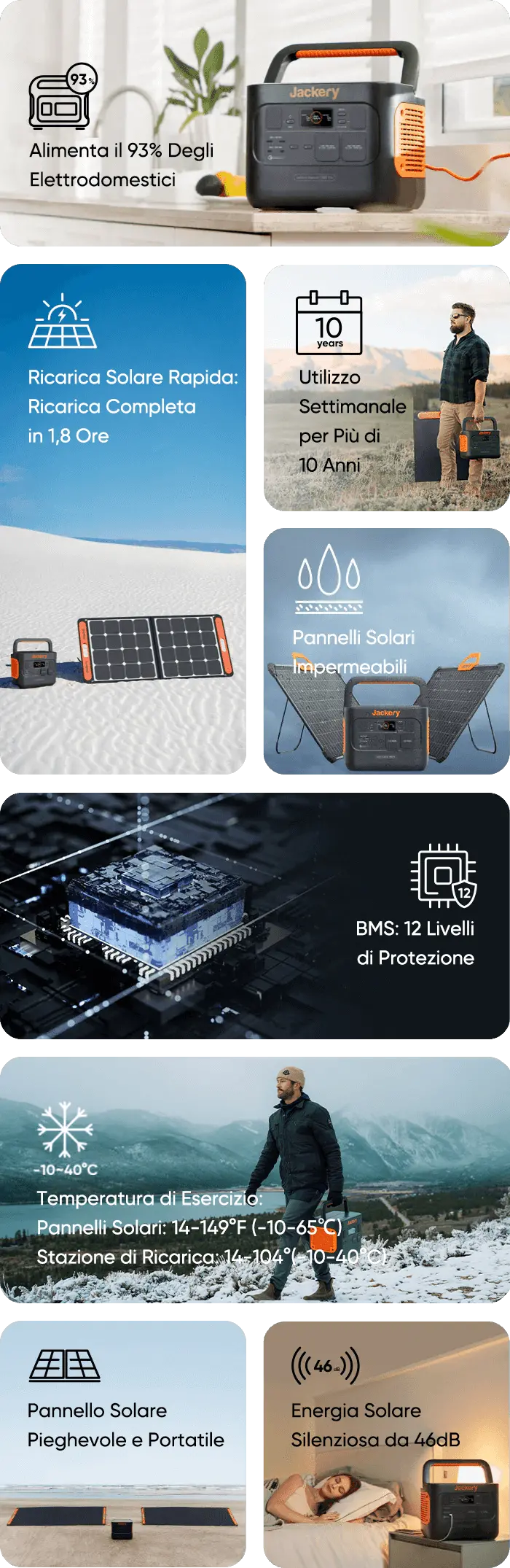 Con Jackery Generatore Solare 1000 Pro ottieni potenza in movimento con un "generatore solare più che veloce"! Il generatore solare super silenzioso ha una lunga durata di oltre 10 anni e può essere caricato completamente in 1,8 ore. Il doppio design PD da 100 W offre una potenza costante, caricando tutti gli apparecchi essenziali durante le interruzioni di corrente e per la vita fuori rete.